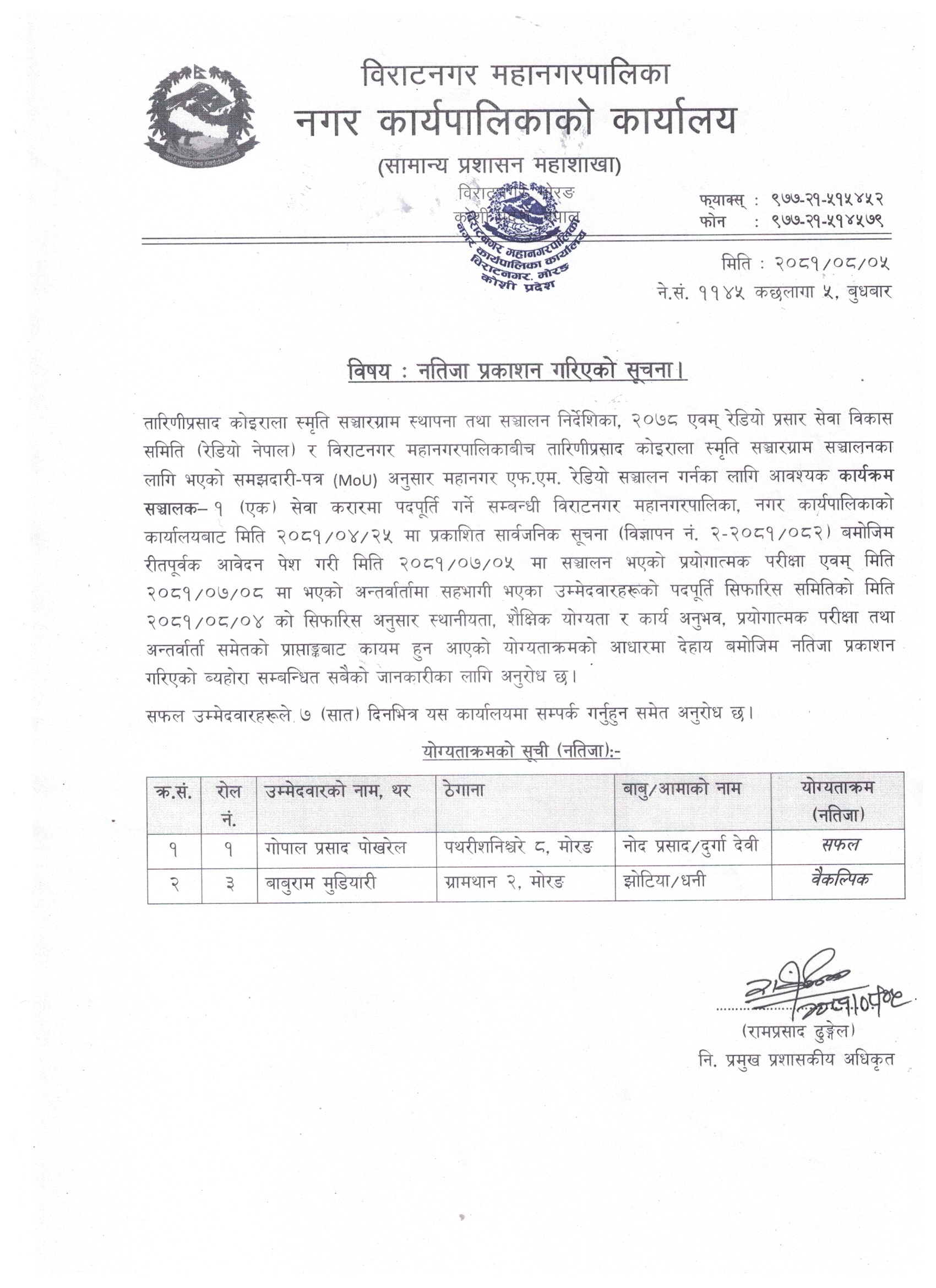 कार्यक्रम सञ्चालक पदको नतिजा प्रकाशन गरिएको सम्बन्धमा