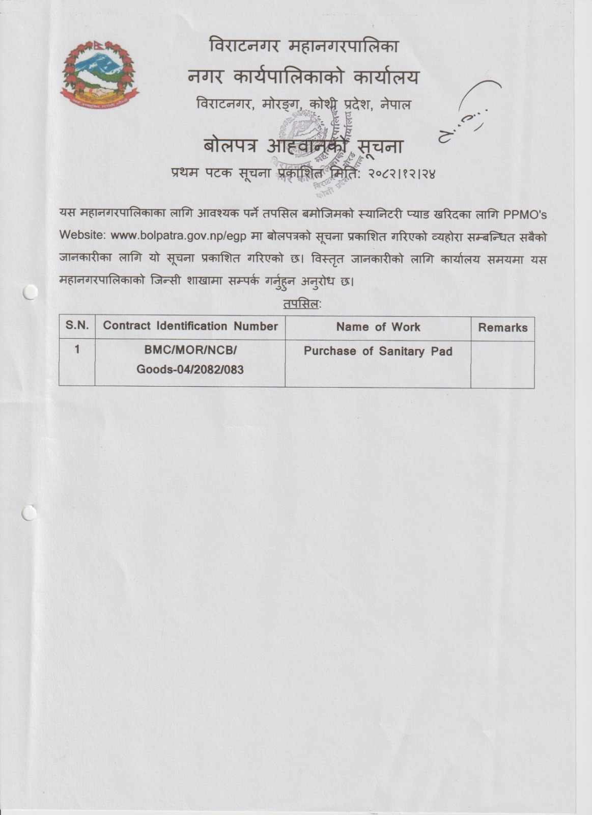सार्वजनिक खरिद/बोलपत्र सूचना