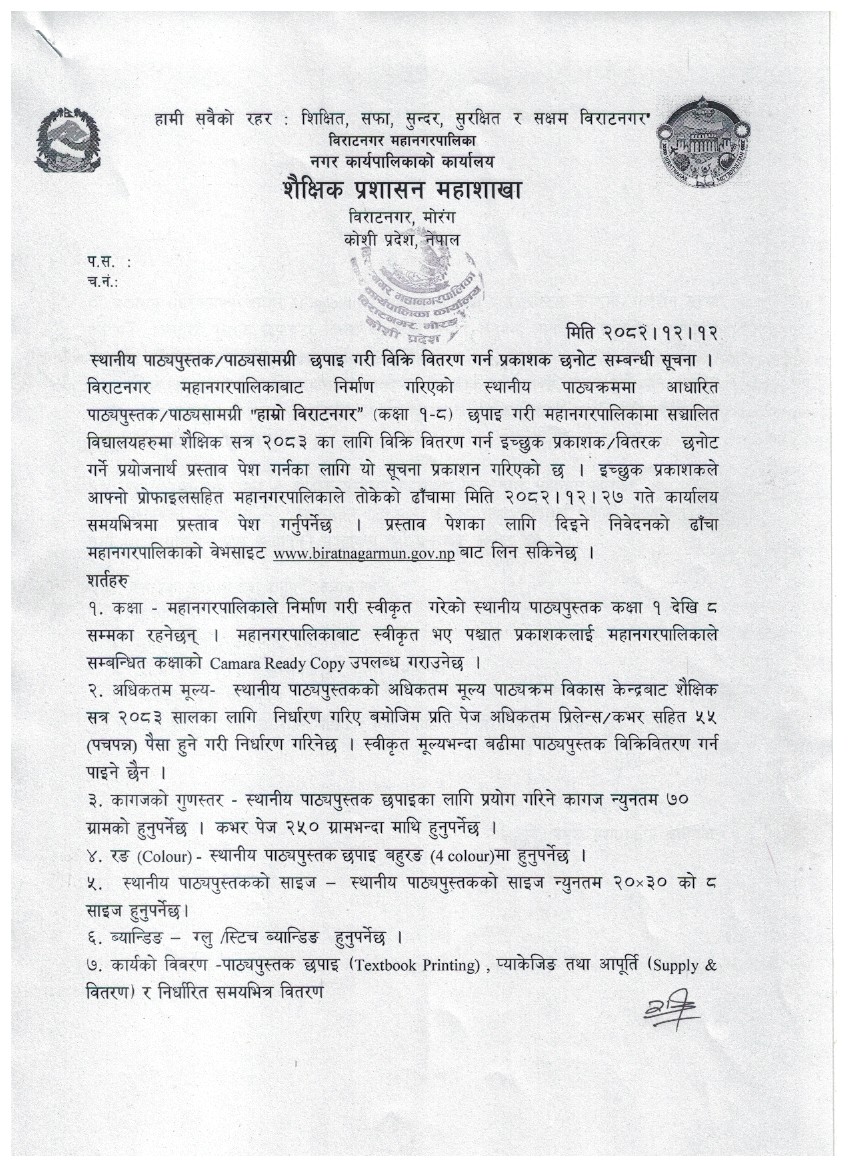» स्थानीय पाठ्यपुस्तक/पाठ्यसामाग्री छपाई गरी विक्रि वितरण गर्न प्रकाशक छनौट सम्बन्धी सूचना।