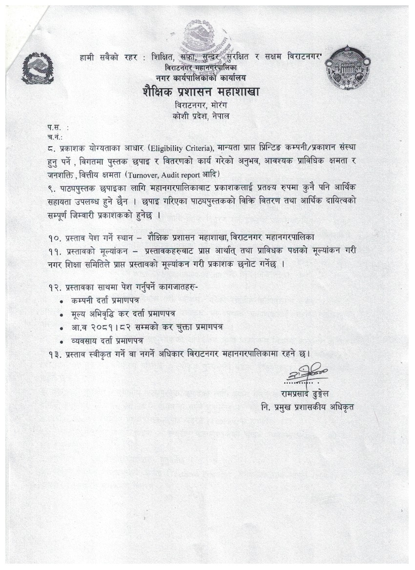स्थानीय पाठ्यपुस्तक/पाठ्यसामाग्री छपाई गरी विक्रि वितरण गर्न प्रकाशक छनौट सम्बन्धी सूचना।